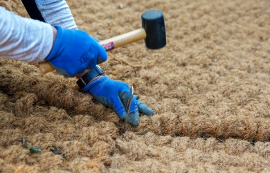 コイヤーグラウンド®は、ココナッツの殻から採取される繊維(コイヤー) からできた100%天然素材の屋外用ロールマットで、広範囲に敷くことができるのが特徴です。